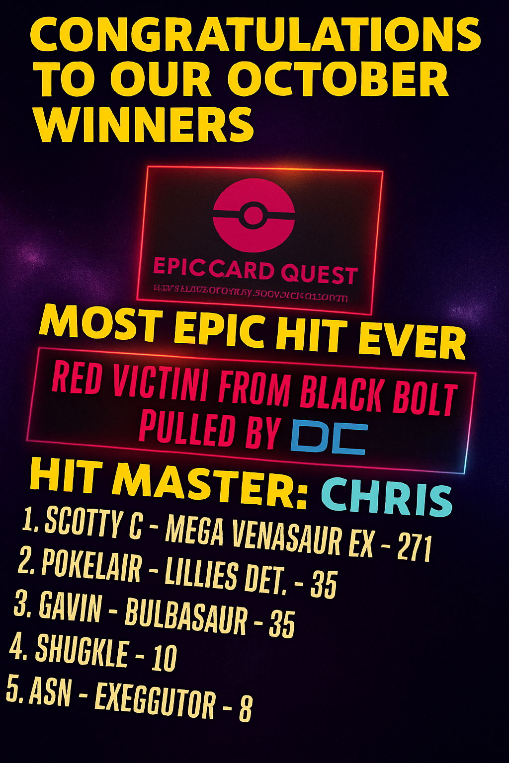 The Leaderboard is an exciting way for the EPIC Family to track and compare their most impressive Pokémon card pulls from our live streams. In the world of Pokémon trading cards, pulling rare and valuable cards is a thrilling experience, more than that the TOP 3 LEADERS on the 15th of every month will receive EPIC prizes (you must be a subscriber to win). The Leaderboard resets every month so you always have a chance to make it to the TOP!