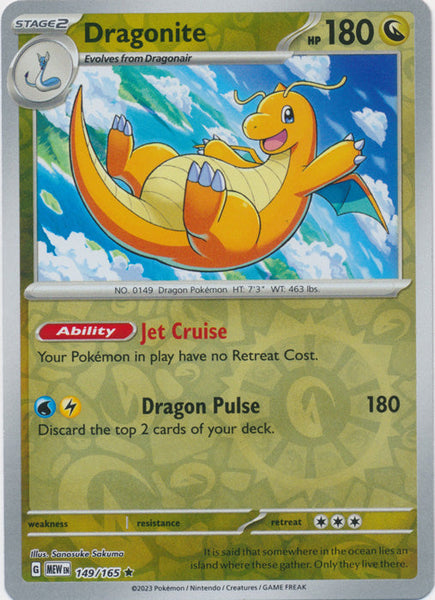 Dragonite Reverse Holofoil from the Scarlet & Violet 151 set showcases this iconic Dragon-type Pokémon with a striking holographic finish that highlights its powerful presence. This card is a valuable addition for collectors and competitive players alike, offering both aesthetic appeal and potential strategic use. Its reverse holofoil treatment enhances the card’s durability and visual impact, making it a standout piece in any collection. Ideal for those seeking to elevate their deck or display with a rare and visually captivating card.