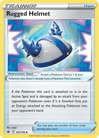 Defend your Active Pokémon with the Rugged Helmet Trainer Item card from the 2021 Chilling Reign set. This protective gear forces your opponent to discard Energy when they attack, adding a layer of disruption to your defensive strategy.